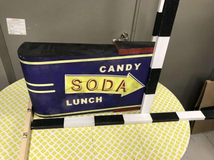 Soda Sign, Vintage-style; Printed vinyl on wood frame, option to set up lighting inside