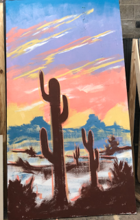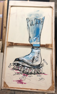 Single Broadway flat. One side shows Santa Fe and the other depicts the political cartoon Jack paints as described in the script. Jacks have been struck from flat for storage, but I can send those with if needed.